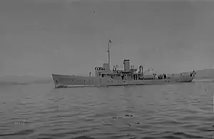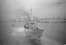After capture Otra was renamed Togo and put in service as a Vorpostenboot[5] and minelayer for the rest of the war.[4] First NT 05 Togo served in as part of Hafenschutzflotille Tromsø guarding that northern city's harbour.[2][6] Later she was transferred to Hafenschutzflottille Oslo.[2] On 21 September 1941, Togo was in collision with the minesweeper R-158 off Hammerfest.[6] Also in 1941, she became part of 59th Vorpostenflottille as V 5908 Togo,[2][7] where she served until April 1944 when she transferred to 65th Vorpostenflottille as V 6512 Togo. After the German surrender she was part of the German Mine Sweeping Administration (GM-SA).[2][8]