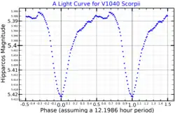 ![]() A light curve for V1040 Scorpii, adapted from Grunhut et al. (2012).[1] The data is from MOST but has been shifted to match the Hipparcos magnitude scale. | |