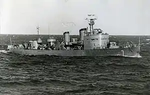 HSwMS Malmö was a destroyer of the Royal Swedish Navy that served during the Second World War and in the Cold War. The third member of the Göteborg or City class, an improvement on the previous Ehrensköld class, Malmö was launched on 22 September 1938. The destroyer served during the war on neutrality patrols and escorts, as well as the evacuation of Gotland in 1941. After the war, the ship was upgraded multiple times. Armament was improved with the introduction of the Bofors 40 mm anti-aircraft gun in 1951 and the Squid mortar ten years later. The latter followed the redefinition of Malmö as an anti-submarine frigate. The ship served in that role for a short time, being decommissioned on 1 February 1965 and broken up as the part of a wider Swedish naval programme of retiring destroyers and frigates.