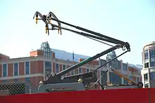 Local preservationist groups such as the Committee of 100 on the Federal City as well as regional planning bodies like the National Capital Planning Commission (NCPC) have opposed the current design of the streetcar system, which relies on overhead electrical wires and a pantograph to conduct power to the streetcar motor.[24] Opponents of the design cite an 1889 federal law banning such systems in Georgetown and the historic center city (defined by the Florida Avenue NE and NW south to the Potomac and Anacostia rivers).[24] The NCPC has also opposed use of the wires along H Street NE, the 11th Street bridges, and in Anacostia.[24] These groups have proposed a design change that would rely on wireless technologies, such as battery-powered vehicles which rely on conduit current collection (in which a metal arm or "plow" is inserted into a channel in the street and draws power from cables under the roadway).[24] But District of Columbia officials say the current overhead lines are not visually obtrusive, and that conduit collection systems are costly and break down easily in cities with wet climates.[24]