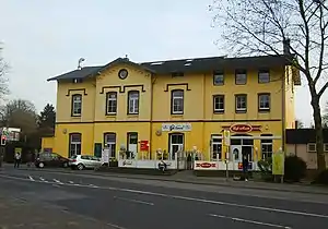 The railway station on the Düsseldorf-Elberfeld line was opened on 3 September 1841 under the name of Haan (Gruiten) and for many years it was the only Haan station. The line to Cologne was opened in 1867 and the current Haan station was opened in 1907, allowing the station in the then independent town of Gruiten to be renamed Gruiten station. In 1909 the existing station building was built. As part of the establishment of S-Bahn services on the Düsseldorf–Wuppertal line in 1988, Gruiten station was significantly rebuilt. The platform on track 1 and the ramps for loading limestone were demolished. This allowed a large park and ride lot to be built. Tracks 2 and 3 were moved and now serve as the S-Bahn station.[6] Track 4 is used as a platform for overtaking trains on the route to and from Cologne. The normal platform for trains to and from Cologne is served by tracks 5 and 6. Track 7 is used by freight trains.