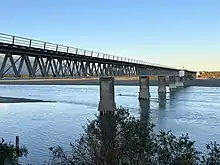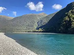 State Highway 6 follows virtually the complete length of the river. From near Haast Pass, the state highway is located on the river's true left. It switches to the true right at the Gates of Haast Bridge. At Pleasant Flat, where the valley widens out, the state highway crosses back to the true left.[3] The final bridge is near the coast, just after the turnoff to the Haast township. At 737 metres (2,418 ft) it is the longest one-lane road bridge in New Zealand, and the 7th longest New Zealand bridge overall.[4]