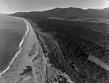 The Haast plain extends 50 km (31 mi) from Ship Creek to Jackson Bay / Okahu. The plain has an unusual landform, with long parallel lines of low hills with narrow swales in between. In some places, the plain is 10 km (6.2 mi) wide, with six rows of dunes and swales. The landform results from the combined effects of sediment carried to the coast by six large rivers, longshore drift and periodic seismic uplifts. The rivers discharging into the Tasman sea in this region of coastline drain from large catchment areas in the Southern Alps, where there is high rainfall and the mountains have high rates of erosion.[5] The suspended sediment yield of the Arawhata River has been reported as 7.18 Mt/yr, and the Haast River as 5.93 Mt/yr. The total estimated suspended sediment yield from rivers in South Westland is over 50 Mt/yr.[6] Longshore drift leads to much of this sediment being deposited along the Haast coastline, forming dunes. The Alpine Fault runs along the inland edge of the plain, and the entire area is subject to tectonic uplift during major seismic events. Following a major uplift, existing dunes are no longer exposed to the action of the sea, and new dunes begin to form. This creates a longitudinal pattern of dunes with low-lying wetlands in between. The coastal plain is approximately 6,000 years old. The dunes close to the current shoreline have little vegetation, but the older dunes further inland are forested with tall podocarps. The swales contain wetland lakes, pakihi and kahikitea swamp forests.[5]