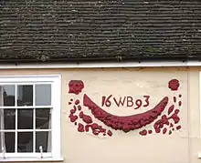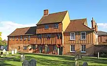The town has a total of 246 listed buildings.[10] Of these, four are Grade I listed: the grouping of St Mary's Church, the Deanery Tower and the Guildhall; and the Coffee Tavern in the High Street. Twenty-seven are II*. Hugh Pigot, curate of Hadleigh, identifies four 'remarkable' houses in his 1866 history of the town:[11] Sun Court; a house in the High St;[12] a house in George St; and Place Farm (demolished). The house in George St has since been identified as a hall house, known as Thorpes in the 1600s, and dated to 1380–1420.[13] It was restored by Mr and Mrs Baines and given a Noel Turner Award by the Hadleigh Society in 2012.[14]
