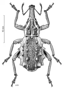 Hadramphus spinipennis species was described by Thomas Broun as having a brown egg-shaped body with glossy brownish-black antennae. It has a prominent tubercle or wart-like projection on each side of its thorax and further tubercles on its abdomen, and a black underside. The length of the adult beetle ranges from 21–22 mm (females can reach 25 mm)[3] excluding the rostrum, and its width is 10 mm.[2][4] It is the only large weevil on the Chatham Islands.[4]