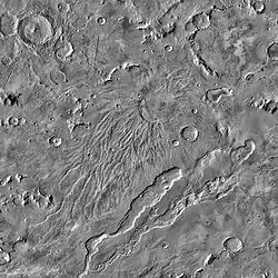 Hadriacus Mons is an ancient, low-relief volcanic mountain on the planet Mars, located in the southern hemisphere just northeast of the impact basin Hellas and southwest of the similar volcano Tyrrhenus Mons. Hadriacus Mons is in the Hellas quadrangle. It has a diameter of 450 kilometres (280 mi). The name was approved in 2007.[1][2] The flanks of Hadriacus Mons have been eroded into gullies; its southern slopes are incised by the outflow channel Dao Vallis. The large extent of volcanic deposits and the caldera size leads some researchers to suggest that these features were the result of an explosive event caused by a contact between magma and groundwater.[3]