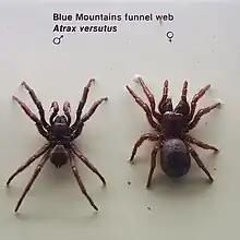| Male (left) and female (right) Blue Mountains funnel-web spiders (Hadronyche versuta) | |