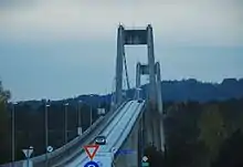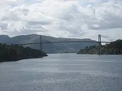 The Hagelsund Bridge (Norwegian: Hagelsundbrua) is a suspension bridge in Alver Municipality in Vestland county, Norway. The bridge connects the island of Flatøy with the village of Knarvik on the mainland. The length of the bridge is 623 metres (2,044 ft). The length of the main span, i.e. the suspended roadway between the bridge's towers, is 250 metres (820 ft).