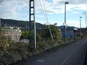 Hagen-Wehringhausen station is a through station in the city of Hagen in the German state of North Rhine-Westphalia. The station was opened on 27 May 1979 on a section of the Düsseldorf-Derendorf–Dortmund Süd railway, opened by the Rhenish Railway Company (German: Rheinische Eisenbahn-Gesellschaft, RhE) between Wuppertal-Wichlinghausen and Hagen RhE station (now Hagen-Eckesey depot) on 15 September 1879.[5] It has one platform track and it is classified by Deutsche Bahn as a category 6 station.[1] The track bed in the station and the nearby bridge at the eastern end of the station are constructed to carry a second track. The only entrance to the station is a staircase which leads to Minervastraße.