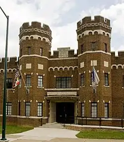 Hagerstown Armory is a historic armory located at 328 N. Potomac Street in Hagerstown, Washington County, Maryland, United States. It is a two-story Flemish bond brick structure with full basement emulating a Medieval fortification, built in 1926. The front facade features a central block offset by two, three-story towers. Tower tops are characterized by a ring of scalloped stone molding, surmounted by a ring of brick dentils, and topped by two crenelles per side with stone caps. The center section is topped by two crenelles with stone caps with stone tablet bearing the seal of the State of Maryland centered between them.[2]