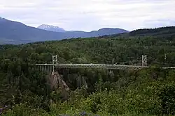 Three previous bridges spanned the same location, the first constructed by Wet'suwet'en people, generations before white settlement. The Wet'suwet'en later reinforced their wooden-pole bridge using cable abandoned after the disbandment of the Russian–American Telegraph expedition.[1][2]
