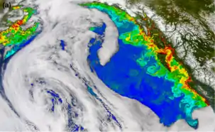Haida Eddies are episodic, clockwise rotating ocean eddies that form during the winter off the west coast of British Columbia's Haida Gwaii and Alaska's Alexander Archipelago. These eddies are notable for their large size, persistence, and frequent recurrence. Rivers flowing off the North American continent supply the continental shelf in the Hecate Strait with warmer, fresher, and nutrient-enriched water. Haida eddies are formed every winter when this rapid outflow of water through the strait wraps around Cape St. James at the southern tip of Haida Gwaii, and meets with the cooler waters of the Alaska Current. This forms a series of plumes which can merge into large eddies that are shed into the northeast Pacific Ocean by late winter, and may persist for up to two years.[1]