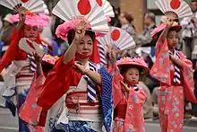 Many people from in and outside of Fukuoka as well as from overseas come to see this enormous festival. This festival has two main parts, the parade and performance. Men and women regardless of age walk through the streets in various costumes, playing various instruments, while others clap with rice scooping spoons (Shamoji). People who join the meeting that is usually held in February can participate in the parade so in the past Mickey Mouse and Snoopy came and joined in the parade.[1] Also, there would be more than 30 stages/performance places in the city.