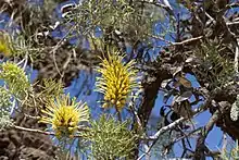 Hakea eyreana, commonly known as straggly corkbark,[2] is a tree in the family Proteacea and is endemic to arid parts of inland Australia. It has needle-shaped leaves, greenish-yellow flowers and oblong to egg-shaped fruit.