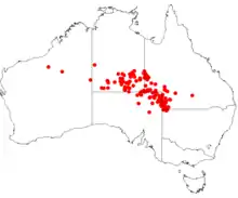 The tree is endemic to an area in the Simpson Desert and Channel Country in outback South Australia, New South Wales, Queensland and the Northern Territory where it is found on sand dunes, sand plains, swales and gibber flats growing in sandy or stony soils.[3]