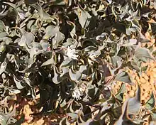 Hakea smilacifolia is an open, sprawling shrub typically growing to a height of 1 to 2 metres (3 to 7 ft) with smooth grey bark and does not form a lignotuber. The branchlets are moderately covered with long, soft hairs or coarse, rough long hairs. The hairs becoming short, soft, rusty coloured and matted at flowering. Flowers are mostly concealed by thick leathery alternate leaves 15–70 mm (0.6–3 in) long by 8–50 cm (3–20 in) wide. The grey-green leaves vary in shape, lower leaves are elliptic to egg-shaped. Leaves nearer to the flowers are broader and taper to a point at the apex. The leaves are often folded over and have curving prominent veins. The inflorescence consists of 5 or 6 white or creamy-white flowers, are sweetly scented and appear in clusters in the leaf axils. The smooth pedicel is 1.2–2 mm (0.047–0.079 in) long, the pistil 14–15 mm (0.55–0.59 in) long and the perianth white. The fruit are smooth, very small and have a 3 dimensional shape, 1.1–1.3 mm (0.043–0.051 in) long and 4–6 mm (0.16–0.24 in) wide and taper to a short pointed beak.[2][3]