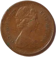 As on all decimal coins produced before 1984, the portrait of Queen Elizabeth II by Arnold Machin appeared on the obverse;[3] in this portrait the Queen wears the 'Girls of Great Britain and Ireland' Tiara.