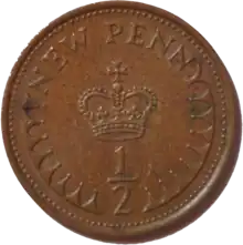 The reverse of the coin, designed by Christopher Ironside, was a representation of St Edward's Crown, with the numeral "1/2" below the crown, and either NEW PENNY (1971–1981) or HALF PENNY (1982–1984) above the crown. Only one design for the obverse was used on the halfpenny coin. The inscription around the portrait on the obverse was ELIZABETH II D.G.REG.F.D. 19xx,[2] where 19xx was the year of minting. Both sides of the coin are encircled by dots, a common feature on coins known as beading.