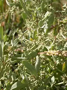 Halimione pedunculata, the pedunculate sea-purslane,[1] is an annual plant occurring on salty sandy grounds along the seashore. It grows with a standing herbaceous stem up to 30 cm high. The leaves are long and spade shaped. The stipules are triangle shaped to oppositely heart shaped, without spikes, with long petioles.[2]
