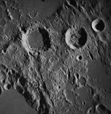 Halley is a lunar impact crater that is intruding into the southern wall of the walled plain Hipparchus. Its diameter is 35 km. The crater is named after the English astronomer Edmond Halley.[1] On the 1645 map by Michael van Langren, the crater is called Gansii, for the gansa (a kind of wild swan) of Francis Godwin's The Man in the Moone.[2] To the southwest of Halley is the large crater Albategnius, and due east lies the slightly smaller Hind.