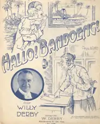 "Hallo Bandoeng" is a song by the Dutch levenslied singer Willy Derby (real name: Willem Frederik Christiaan Dieben, 1886-1944). It was released in 1929 and sold more than 50,000 copies, an astronomical number for that time.[1] It was one of Derby's songs that became part of Dutch culture.[2] The phrase "Hallo Bandoeng" was well known at that time, as the usual opening used by Radio Kootwijk when establishing a connection with Bandung (in Dutch: "Bandoeng"), one of the most important cities in the then Dutch East Indies.[3]