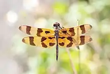 The Halloween pennant's wings are entirely orange-yellow in color with dark brown bands, the Halloween inspiration for its common name.[3] Dragonflies of its genus perch at the tips of plants, waving in the breeze like pennants.[4] The young has yellow markings, including a stripe on its back. The adult male and female may develop pale red markings, especially on the face. This species is about 38 to 42 millimetres long. It is orange.[5][6][7]