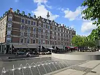 The north side of the square is lined with residential buildings from the 1890s. The building between Lille Istedgade and Abel Cathrine Gade was built from 1897 to 1898 to the design of Emil Blichfeldt who has also designed the main entrance of Tivoli Gardens on the other side of the Central Station.