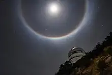 A halo (from Ancient Greek ἅλως (hálōs) 'threshing floor, disk')[1] is an optical phenomenon produced by light (typically from the Sun or Moon) interacting with ice crystals suspended in the atmosphere. Halos can have many forms, ranging from colored or white rings to arcs and spots in the sky. Many of these appear near the Sun or Moon, but others occur elsewhere or even in the opposite part of the sky. Among the best known halo types are the circular halo (properly called the 22° halo), light pillars, and sun dogs, but many others occur; some are fairly common while others are extremely rare.