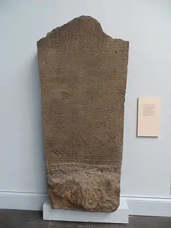 The Hamadab Stela is a colossal sandstone stela found at Hamadab just south of the ancient site of Meroë in Sudan. Now kept at the British Museum, the significance of the stela resides in the fact that it is inscribed with one of the longest known texts in the Meroitic script.[1][2]