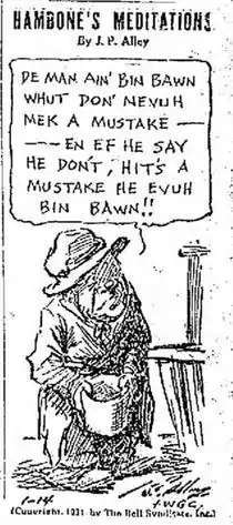 Hambone's Meditations was a comic strip produced from 1916 to 1968, and syndicated initially by the McClure Newspaper Syndicate and later by the Bell Syndicate.[1] Produced by two generations of the Alley family, the one-panel cartoon originated with the Memphis, Tennessee, newspaper The Commercial Appeal, where it ran on the front page. The title character was a stereotypical African-American man with wide eyes and exaggerated large lips. He dispensed folk wisdom in caricatured dialect.