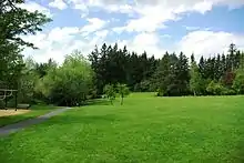 The natural area is to the west of the developed portion and includes a wooded area traversed by a small creek, a tributary of McKay Creek.[17] There are also wetlands, a ravine, and a pond in this section of the park.[17] The area includes several bridges and trails covered with barkdust.[13] Trees in the park include lodgepole pines, blue spruce, Pacific yews, Pacific dogwoods, western red cedars, old-growth Douglas-fir, oak, vine maple, and sequoia trees.[13][17] Other flora include red huckleberry, Oregon grape, pink star flowers, stinging nettles, and other native plants.[17] Birds at the park are Bewick's wrens, dark-eyed juncos, song sparrows, black-capped chickadees, scrub jays, and ducks among others.[17] Animals include possums, bats, and raccoons.[17][18] There is a half-mile trail through the natural section that leads to a slough.[17]