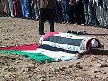 The remains of Hamdi Lembarki, covered with the Sahrawi Arab Democratic Republic flag, during his funeral in the outskirts of El Aaiun. Gdeim Izik (Western Sahara), 14 January 2006.