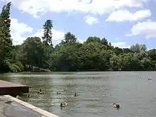 A focal point of Hamilton Gardens is Turtle Lake, an artificial lake and duck habitat with a stage on one side and a walkway running above the water on the other. The four-metre horsetail waterfall flowing into the lake is the only waterfall in Hamilton.[63] An independently owned cafe, restaurant and catering company operates at the lake, serving a variety of coffees, snacks, meals and ice creams.[64] The cafe's al fresco dining area looks out on the lake.[65]