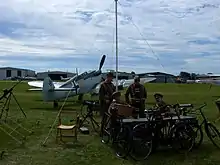 RAF Henlow was the film's base of operations for the restoration and modification of the Hurricanes and Spitfires, and it was here that the various marks of Spitfire were converted to resemble the 1940 variant.[21] Mahaddie's big coup was discovering that the Spanish Air Force was still using licence built Messerschmitt 109 fighters as trainers and Heinkel 111 bombers as transports, ironically both now powered using Rolls-Royce engines. He persuaded the Spanish air force to co-operate in the filming of Battle of Britain. This provided the film with its "Luftwaffe" aircraft.[19] All told he acquired the use of 115 British and German designed aircraft.[18]