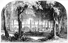 According to Jacob Riis, there were two stone obelisks erected (subsequently) at the spot, which were both eventually carried away by relic-seekers. Therefore, in 1879, J.S. Nathanson, who rented Marienlyst castle and operated a luxury hotel there from 1859 to 1896, marked Hamlet's grave with a large heap of stones. He would re-supply the stones regularly as they were carried away as relics by tourists. Nathanson's display of Hamlet's grave for the benefit of "the credulous and sentimental" and the aggressive use of the name of Hamlet in the advertisement of Hotel Marienlyst was much criticized at the time.[3]