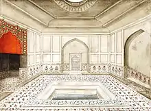 The whole interior was richly decorated with colorful inlaid pietra dura floral designs made of white marble.[2] The floors and dados of these apartments are finished with white marble as well.[1] sui