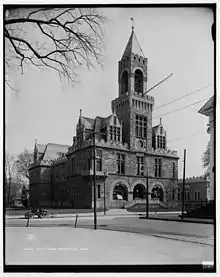 Hampden County Courthouse is a historic courthouse on Elm Street in Springfield, Massachusetts designed by Henry Hobson Richardson. This was the county's second courthouse. The first courthouse was a small meetinghouse structure built in 1740, and the second and was constructed in 1822, but by the 1860s, popular pressure was developing for a new proper courthouse. A grand jury indicted the county commissioners in 1869 for official misconduct since the courthouse did not have fireproof storage for the registry of deeds and the safekeeping of public records. This forced the county to build a new courthouse.[2]