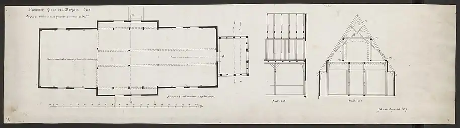 At some point, the old stave church was torn down and replaced by a new timber-framed long church building. The new timber church is clad with planks that probably originate from the old stave church. The present church at Hamre cannot be dated precisely. It was historically thought to have been built around 1622, but more recently an inscription on the old main door was found that suggests that it may have been built in 1585 (in which case it is the oldest existing wooden church to be built near Bergen). The wooden church was heavily renovated in 1649. Inside the church is a 1.4-metre (4 ft 7 in) high stone altar, which may indicate that the present church was built around the old stone altar from the historic stave church on the same site. The nave is rather unique in that it has a small extension in the middle of the nave, making that part about 2 metres (6 ft 7 in) wider than the rest of the nave, almost giving the church a cruciform appearance.[3][4][5][6]
