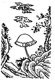 Jinqingzhi (Metal Essence Excrescence) grows on Mount Hua. It has a white cap, and white birdlike clouds growing above the stem. Its flavor is sweet and pungent. It should be picked on a ren (壬, "9th of the 10 Heavenly Stems") day in October, and dried in the shade for 100 days. Anyone who eats it will live for 8,000 years. After eating this excrescence Han Zhong became a Transcendent. [金精芝生於華山白蓋莖上有白雲狀如雀雞其味甘辛十月壬日採之陰乾百日食之八千歲韓眾食之仙矣].