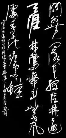 One of the stylistically most important developments of Han poetry can be found in the Nineteen Old Poems collection. Although extant versions exist only in later collections, particularly the Wen Xuan literary compendium, the 19 poems themselves appear to be from the Han period. They are influential both toward the gushi ("old style") poetic form, but also for their "tone of brooding melancholy....Anonymous voices speaking to us from a shadowy past, they sound a note of sadness that is to dominate the poetry of the centuries that follow."[13] Many versions of these 19 poems thus continued to be reinvented in post-Han times, including a major revival in Tang poetry times. As Nineteen Old Poems literally means "19 gushi, poetry written in inspiration by this style were referred to as being in the gushi style, or simply labeled gushi (also transcribed as ku-shi, in English).