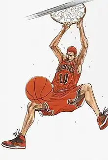 Serving as Shohoku's power forward, Hanamichi Sakuragi stars as the protagonist of Slam Dunk. His jersey number is 10 and he is a freshman (grade ten) at Shohoku High. At the beginning of the series, Sakuragi is a bad boy and a slacker, good for nothing other than fighting. He is the leader of the feared Sakuragi Legion, which consists of his four friends Mito, Noma, Ohkusu and Takamiya. After being rejected fifty times by girls during junior high school, Sakuragi meets and falls in love with Haruko Akagi, a basketball fangirl who is also in grade ten.[1] This and Haruko's encouragement lead him to join the Shohoku basketball team.[2] However, as a complete beginner, he is not able to keep up with the rest of the team despite his outstanding height, athleticism, stamina, speed and leaping ability.[3]