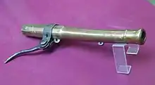 The hand cannon (simplified Chinese: 火铳; traditional Chinese: 火銃; pinyin: huǒchòng or 手铳; 手銃; shǒuchòng), also known as the gonne or handgonne, is the first true firearm and the successor of the fire lance.[1] It is the oldest type of small arms as well as the most mechanically simple form of metal barrel firearms. Unlike matchlock firearms it requires direct manual external ignition through a touch hole without any form of firing mechanism. It may also be considered a forerunner of the handgun. The hand cannon was widely used in China from the 13th century onward and later throughout Eurasia in the 14th century. In 15th century Europe, the hand cannon evolved to become the matchlock arquebus, which became the first firearm to have a trigger.[2]