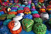 Another important product is lacquerware, part of a larger Mesoamerican craft tradition. Most is produced in Olinalá, but there are also production in nearly Acapetlahuaya and Temalscacingo.[4] Lacquer work dates back to the pre Hispanic period, when it was used to preserve and decorate wood objects, gourds and more. It survives mostly intact, with changes only in decorative motifs through the colonial period to modern times. Until recently, most wood items were made from a fragrant species called linaloe, but over exploitation has made it scarce and expensive.[4]