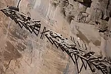 The Hanging Flume was an open water chute (known as a flume) built over the Dolores River Canyon in Colorado. The Montrose Placer Mining Company built the flume in the 1880s to facilitate gold mining. Some sections of the flume remain attached to the canyon wall, although much of the wood has vanished.[2]