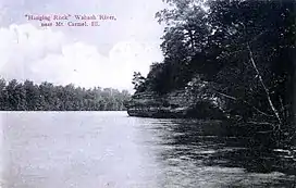 Hanging Rock is located on the Wabash River in the state of Illinois about three miles northeast of Mount Carmel, Illinois.[7] Hanging Rock has been described as a "semicircular rock wall which, in the center, rears its huge pinnacle over a hundred feet above the water and projects over the river many feet."[8] The Grand Rapids Dam was located a short distance downstream from Hanging Rock until it was abandoned by the Federal Government in 1931.