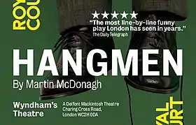 Hangmen is a play by the British-Irish playwright Martin McDonagh. It received its world premiere at the Royal Court Theatre, London, in September 2015, before transferring to the West End's Wyndham's Theatre.[1] The play was directed by Matthew Dunster, designed by Anna Fleischle, and featured David Morrissey and Reece Shearsmith among others. It was universally acclaimed by theatre critics, and was nominated for numerous awards including the Olivier Awards, Critics' Circle Theatre Awards and the Evening Standard Theatre Awards.[2] For its U.S. premiere in 2018 at Off-Broadway's Atlantic Theater Company, Hangmen won the New York Drama Critics' Circle Award for Best Foreign Play.[3]