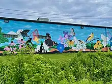 Other works are two-dimensional paintings or murals. The Civil Rights River Loop Murals share quotations from Chief Joseph and Benito Juárez while teaching about the open housing racial justice protests led by James Groppi nearby in the late 1960s.[19] The Kelmann Restoration mural is a 130-foot (40 m) long painting that mixes native elements of the southeastern Wisconsin landscape with scenes of building restorations.[24] March On depicts silhouettes marching in front of a sunset, celebrating the 40-year anniversary of the open housing protests.[19][18] The Valley Passage Mural mixes a depiction of what is on the other side of the tunnel it is painted on with what used to be there in the past.[18]