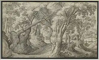 Bol is principally known for his extensive graphic oeuvre of both uncoloured drawings and prints. His earliest known drawing depicting a Landscape with trees and a watermill (signed and dated 1557, Museum Boijmans Van Beuningen) shows the influence of Pieter Bruegel the Elder. In the drawing Bol distanced himself from the Flemish tradition of the world landscape with its imaginary mountain landscapes with jagged rocks in favor of a more realistic approach based on observation of nature. The drawing also points to Bol's possible familiarity with the work of the Master of the Small Landscapes, an unidentified artist from that time whose drawings for two series of prints show innovative, idealized rural scenes from around Antwerp in 1559 and in 1661.[9] The Master of the Small Landscapes depicted real rather than imaginary landscapes, something which would be influential on future Flemish landscape artists, including Bol.[10]