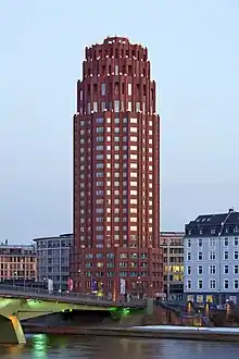 In Berlin, he has designed in Potsdamer Platz a high-rise tower in an old-New York brick style, for DaimlerChrysler. He was also responsible for the master planning of high-rise buildings on the Alexanderplatz.[6] Among his works are also the reconstruction of the former Reichsbank into the new Foreign Office, and the so-called Leibnizkolonnaden in the district of Charlottenburg-Wilmersdorf near the Kurfürstendamm. In 2005 he constructed the inner rooms of the exclusive night club Goya on Nollendorfplatz, that opened on December 1 in the building where the Metropol had formerly been. In Frankfurt am Main he has erected the 88 meter tall residential building Main Plaza in the Deutschherrnviertel. At Alte Messe Leipzig, he designed in 1996 one of the nine head offices of the German Central Bank.[7] which was in 1999 awarded the Architekturpreis der Stadt Leipzig (Architecture Award of the City of Leipzig).[8]