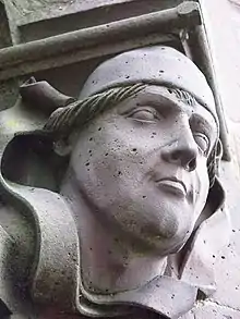 On the Martinstower there is a bust of about 40 cm,[5] which is strongly assumed to depict Nussdorf.[9] Beside's the bust, on the same working block of sandstone from Wiesental there is a masons sign to be seen.[9] He wears a leather cap under which some locks of hair are to be seen.[9][5] The bust is hewn out of high quality stone and is located at the north-face of the tower, which is less affected by the weather.[9] According to the appointments of the Minster masonry, he worked also on the ceiling of the small cloister and the surrounding walls of the large cloister.[5]